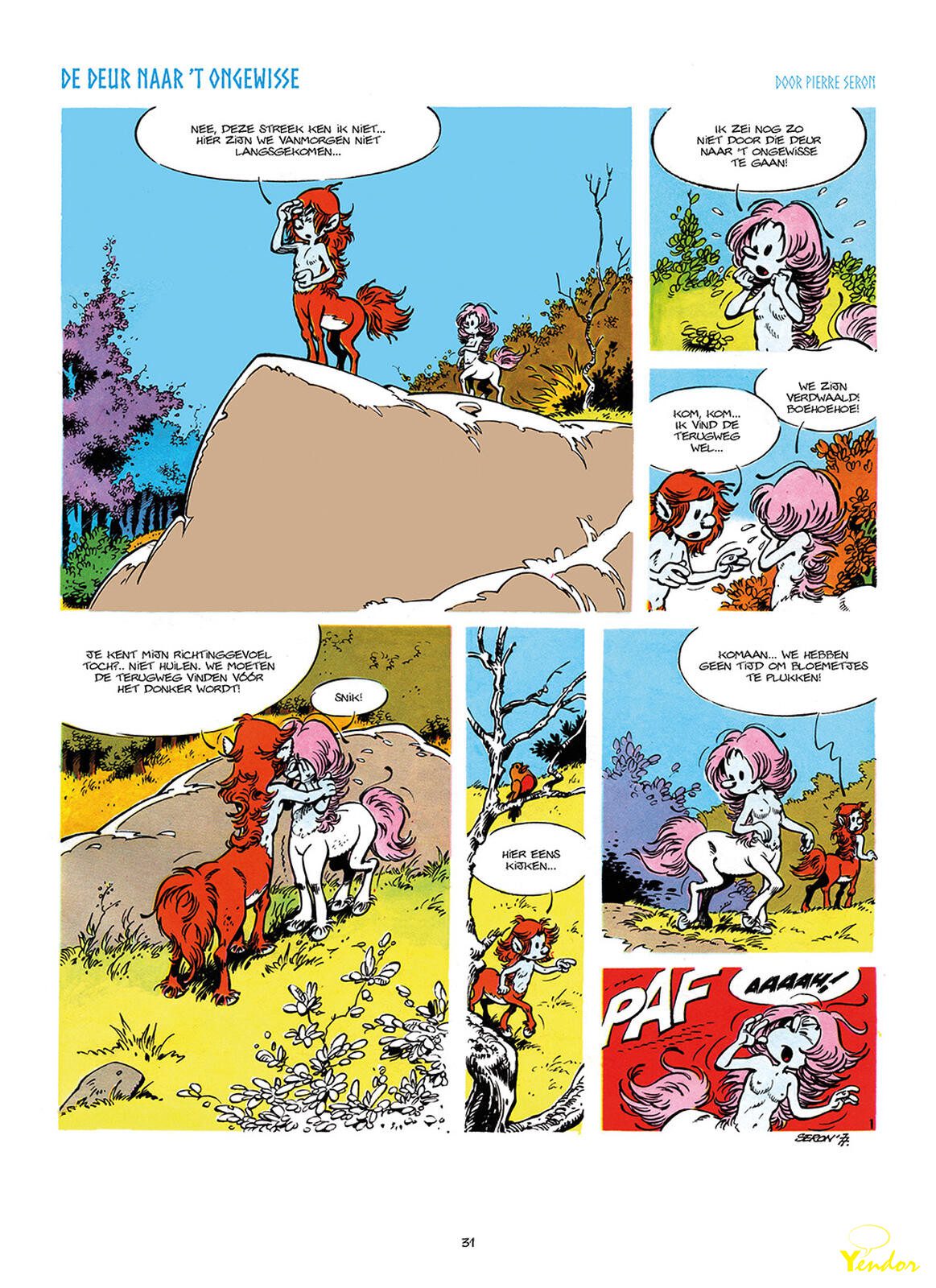 “In de jaren 1970 scheert Pierre Seron bij de lezers van het weekblad Robbedoes hoge toppen met zijn De Minimensjes. De productieve tekenaar wil een nieuwe reeks lanceren, eentje waarin hij eigen passies kan verwerken. Hij schept Aurora en Ulysses, twee jonge Centauren uit het godenrijk Olympos die verdwaald zijn op Aarde. Ze beleven avonturen in diverse tijdperken op zoek naar de deur die hen terug moet brengen naar hun thuis. Seron stopt veel tederheid en persoonlijkheid in de verhalen. Tegelijk fungeren ze als leedverwerking.