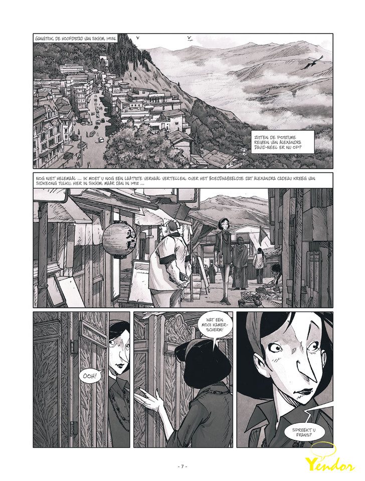 “Zelfs na haar dood blijft Alexandra David-Néel geheimen onthullen uit haar wonderbaarlijke leven. Tussen de schatten die de grote ontdekkingsreizigster heeft nagelaten, ontdekt Marie-Madeleine, haar begeleidster en vertrouwelinge, een ongelooflijk kostbaar bronzen Boeddhabeeldje. Het is een geschenk van de maharadja van Sikkim, die indertijd de poorten van Tibet voor haar opende. Voor Marie-Madeleine vangt dan een nieuwe missie aan: de laatste wens van de overledene inwilligen door het onschatbare beeldje naar zijn thuisland terug te brengen…”